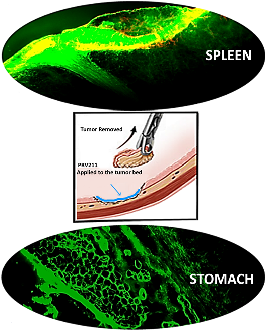 Figure 2: Images of spleen and stomach tumor beds lined with Florescent PRV211 indicating high concentration of anticancer drug in the tumor bed. PRV211 can be used on any solid tumor surgery, such as Spleen, bladder, esophagus and stomach